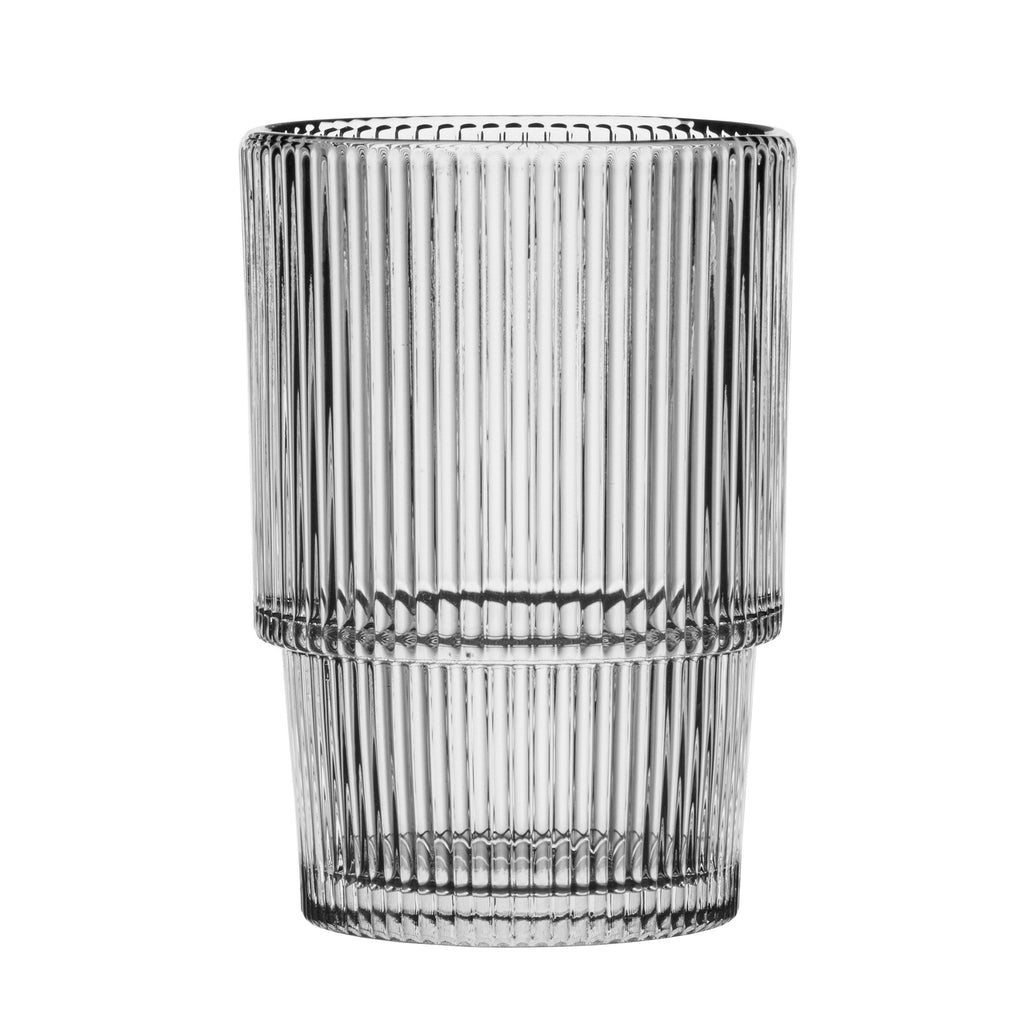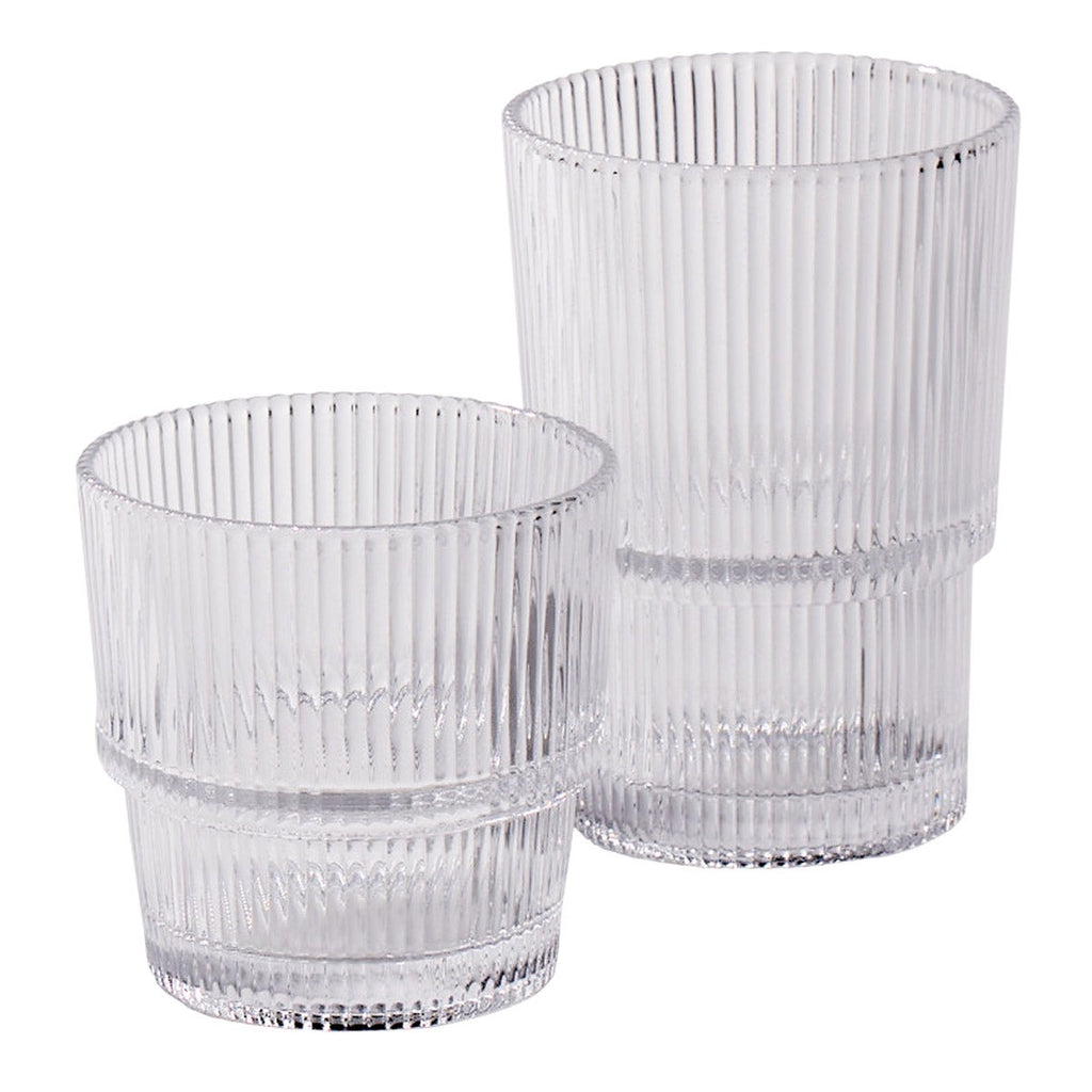The Anchor Hocking Monaco 16-Piece Ribbed Drinkware Set includes eight 15-ounce tumblers and eight 11.8-ounce double old fashioned glasses, featuring a classic ribbed design made from ultra-clear pressed glass. This versatile glassware set is perfect for everyday use or entertaining, with each piece crafted to feel substantial and premium in hand.